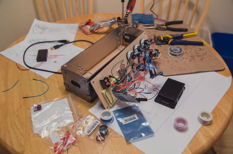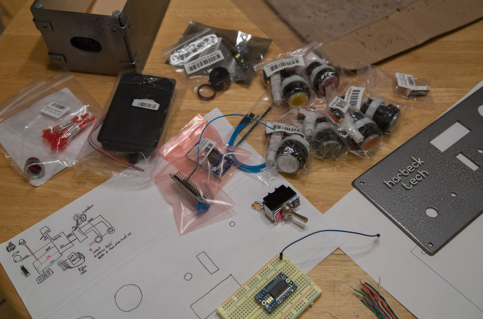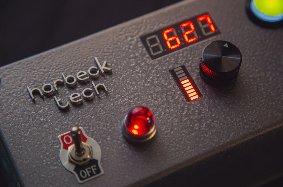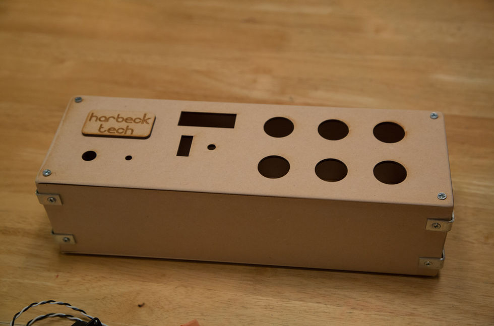 The retro DIY Arduino Sound FX box plays different dinousaur sounds when a button is pressed. The box has 6 unique sounds that can be customized. The components have a retro feel such as a volume control dial and a toggle switch.